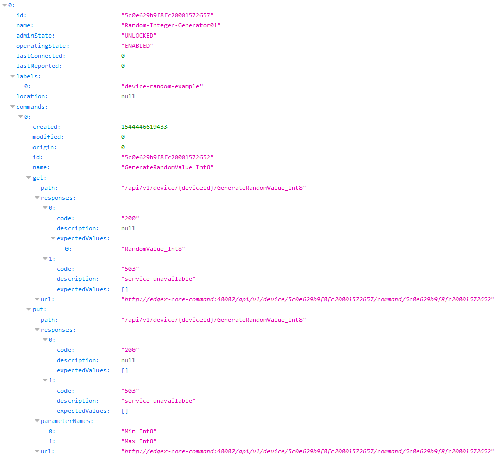 The Random Integer Device Service is a sample Device Service that can run directly with other EdgeX services. It has a default, pre-defined device profile (see the device.random.yaml file), device and schedule events (see the configuration.toml file). After the EdgeX Core Service and Random Integer Device Service start, the following Core Service APIs can be viewed in the browser: