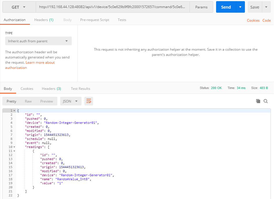 If you replace the host and run the GET command for GenerateRandomValue_Int8, you receive an event with a random reading value between -128 and 127, as illustrated below: